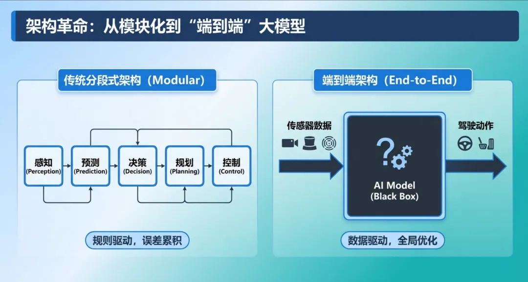 2022年特斯拉AI Day发布占用网络(Occupancy Network),2023年FSD V12推出纯神经网络Planner,标志着端到端技术的真正落地。这意味着从感知到决策不再是传统分段式架构(又称模组化Modular)的规则驱动,而是一个统一的神经网络直接输出驾驶动作。