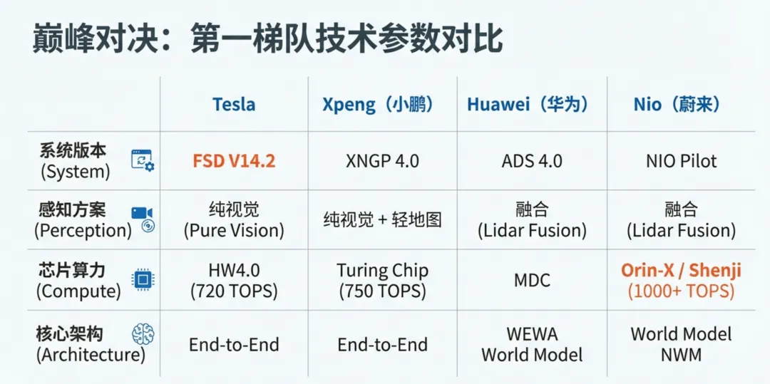 主车厂正在形成“算力+模型+软件栈”的完整生态。蔚来神玑NX9031已上车ET9,1000 TOPS算力;小鹏图灵AI芯片上车G7,750 TOPS;理想M100预计2026年上车;吉利星辰一号512 TOPS。自研芯片成为头部车企的标配。特斯拉、小鹏、华为及蔚来基本站稳自动驾驶第一梯队。
