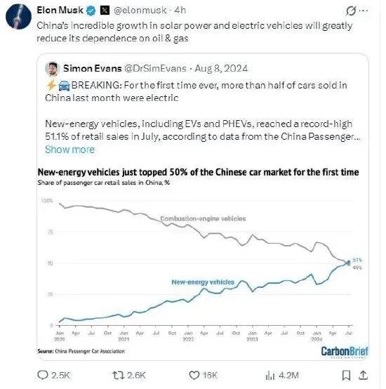 马斯克回应称:“中国在太阳能和电动汽车领域的惊人增长将极大地降低对石油和天然气的依赖。”