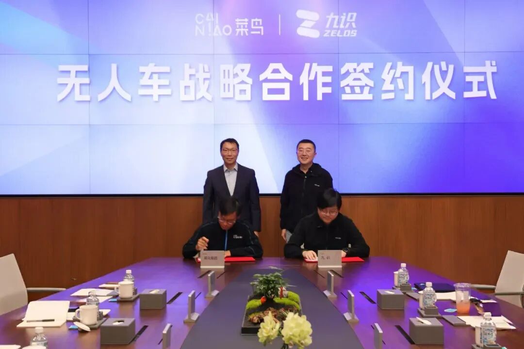 签约仪式现场,九识智能CEO孔旗、联合创始人周清与菜鸟集团CEO万霖、菜鸟无人车业务负责人李尚青共同出席,标志着这一战略合作正式启航。