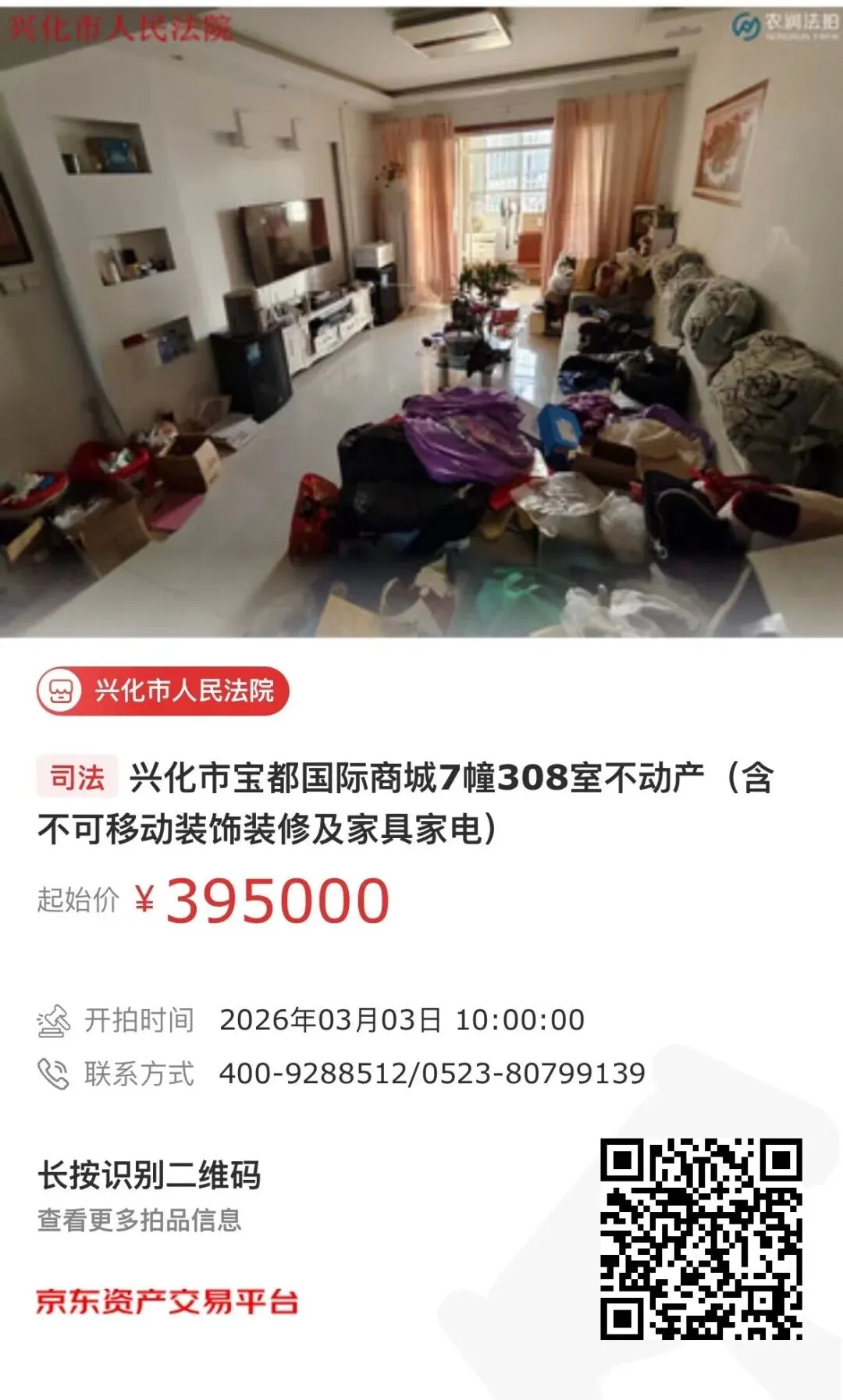 【第一次拍卖】兴化市宝都国际商城7幢308室不动产(含不可移动装饰装修及家具家电)