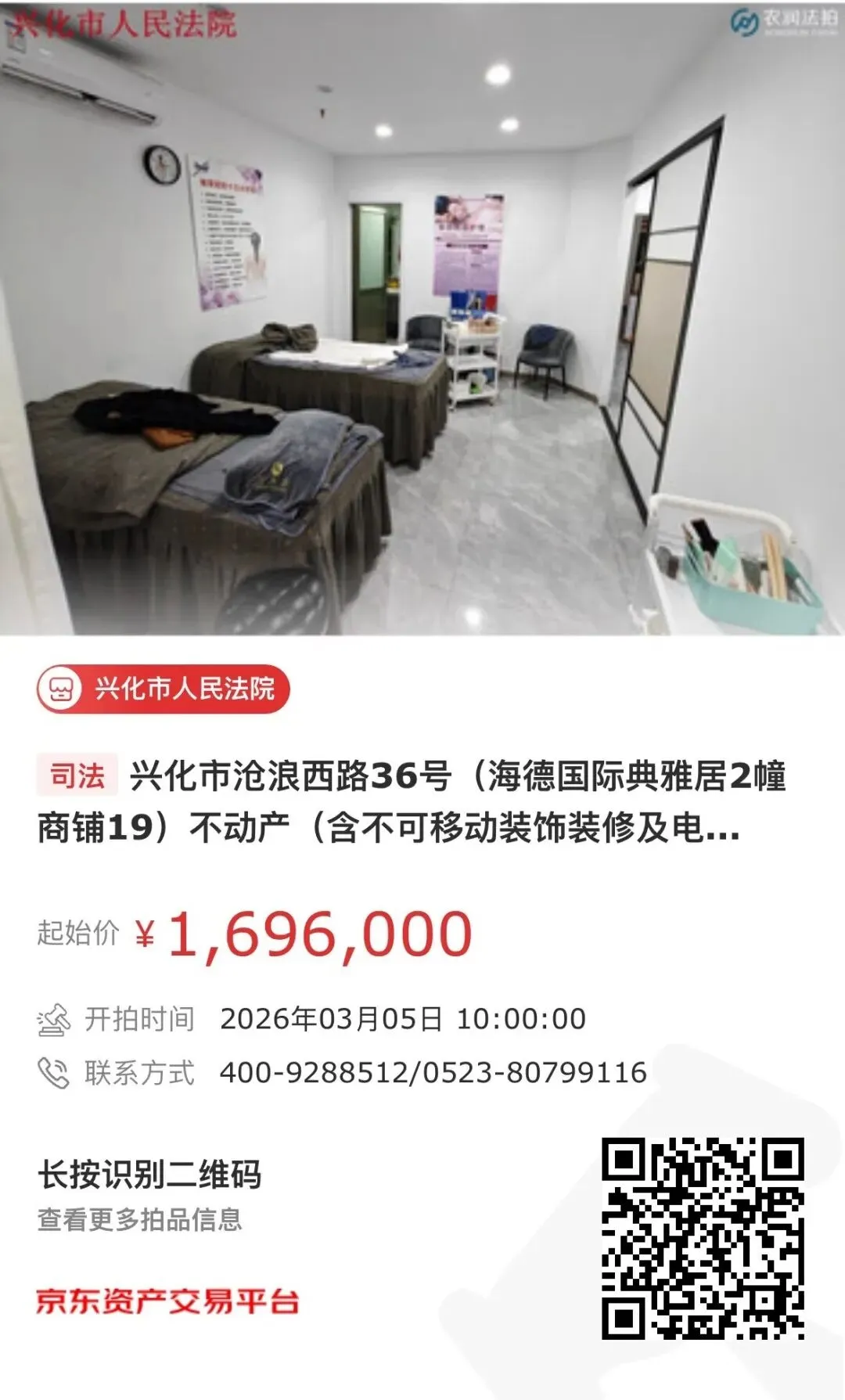 【第一次拍卖】兴化市沧浪西路36号(海德国际典雅居2幢商铺19)不动产(含不可移动装饰装修及家具家电)