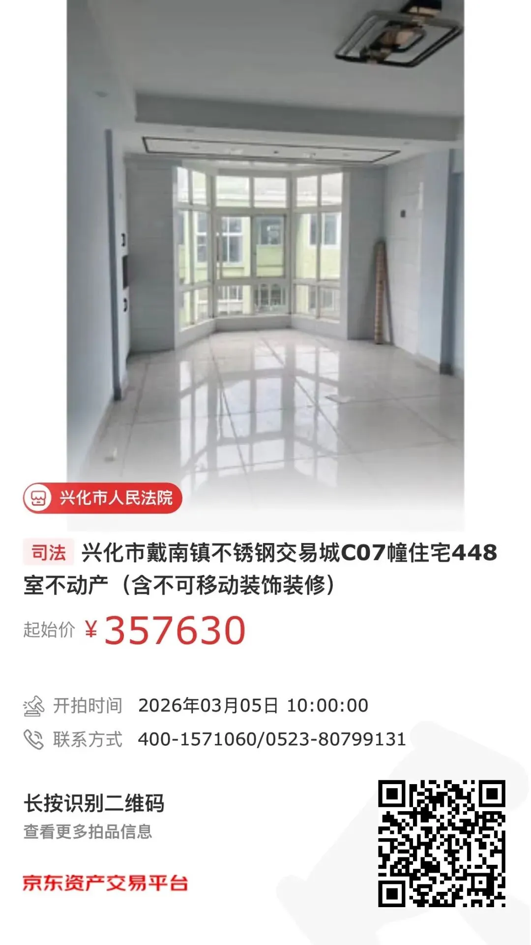 【第一次拍卖】兴化市戴南镇不锈钢交易城C07幢住宅448室不动产(含不可移动装饰装修)