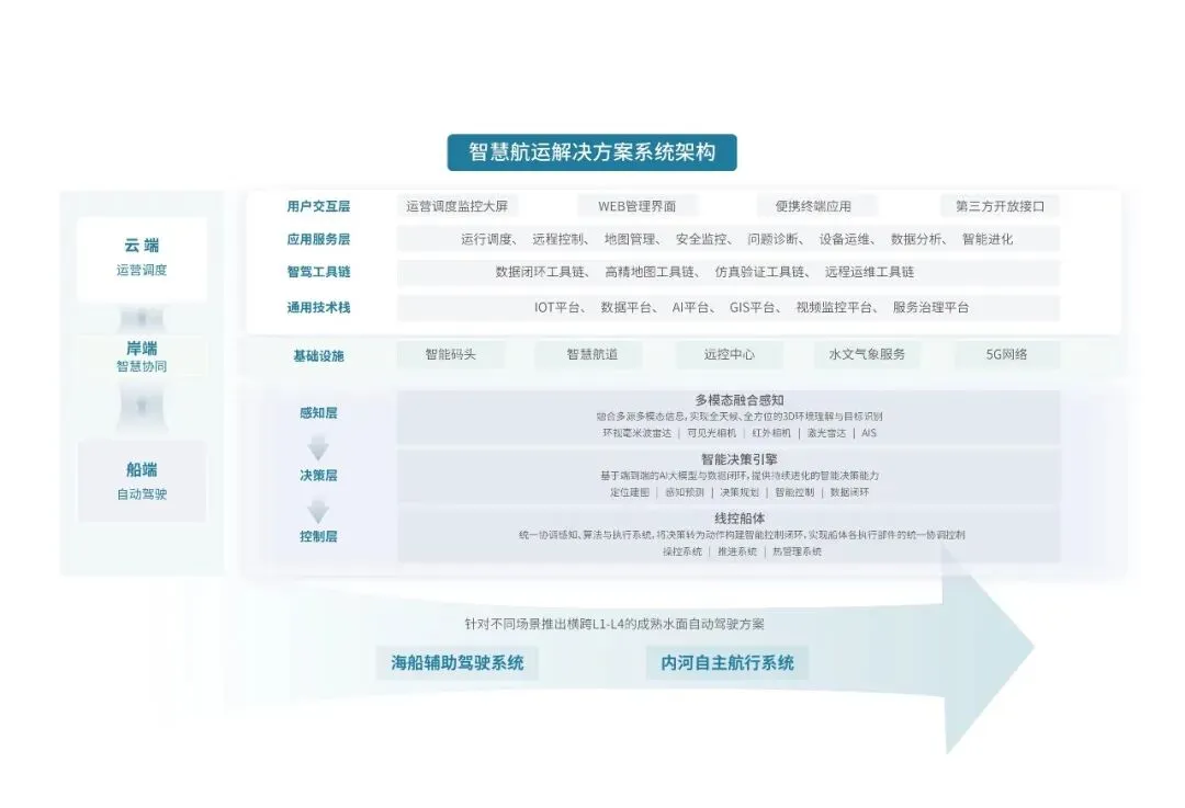 在该架构中,船端聚焦多模态融合感知、智能决策与精准控制,完成对复杂水域环境的自主航行响应;云端作为系统中枢,承担跨船数据汇聚、模型训练与策略统一下发,弥补单船算力与学习能力的局限,持续提升AI模型的泛化与演进能力;另外通过协同调度与远程接管,实现对船队运行状态的统一管理及风险应对,为“减人增安、降本增效”的规模化运营提供保障。