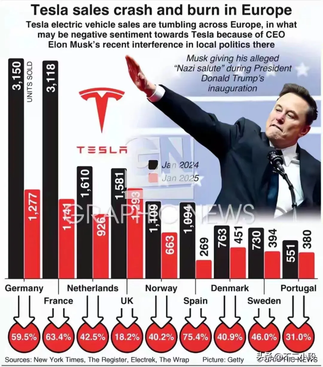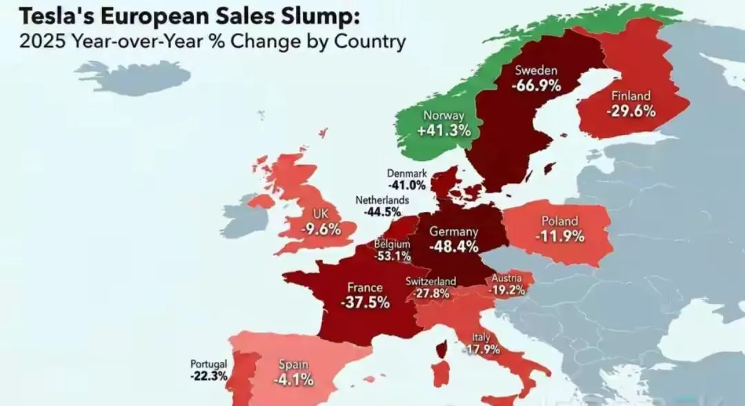 数据显示,特斯拉去年在欧洲销量23.8万辆,同比暴跌27%,欧盟核心区域跌幅更逼近38%,市场份额从2.3%腰斩至1.4%,彻底褪去昔日领头羊光环。但这并非欧洲人抛弃电动车,相反欧盟纯电市场份额从2024年13.6%攀升至17.4%,电动化浪潮依旧强劲。而比亚迪全年在欧销量18.7万辆,同比暴增268%,德、英等核心市场更是反超特斯拉,显然欧洲消费者并非不买电动车,只是不再偏爱特斯拉,中国制造已成新选择。特斯拉的欧洲败局,是自身三大硬伤导致的结构性衰落。其一,品牌与马斯克过度捆绑引发口碑危机,其政治高调站队、支持德国极右翼的行为,触碰欧洲主流价值观红线,遭波兰官方抵制,品牌光环彻底消散;其二,产品创新长期停滞,Model Y上市五年无全新车型,小改款在多国竞品面前毫无新鲜感,让消费者失去选择理由;其三,竞争维度全面错位,上有大众、宝马等本土车企凭品牌积淀和本土化优势抢占平价市场,下有中国车企展开全维度竞争,特斯拉先发优势尽失,陷入上下夹击的被动。