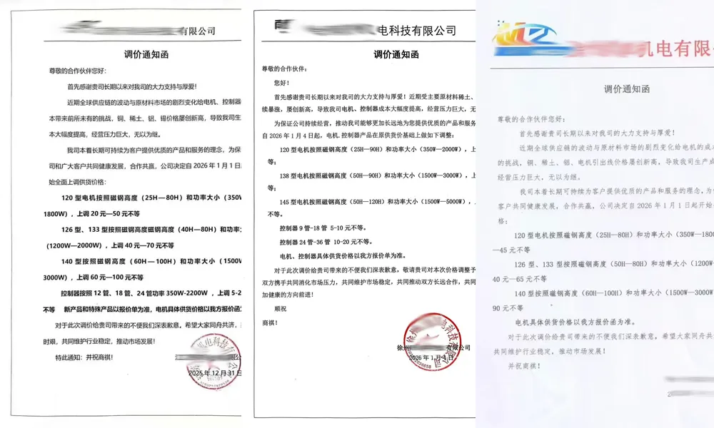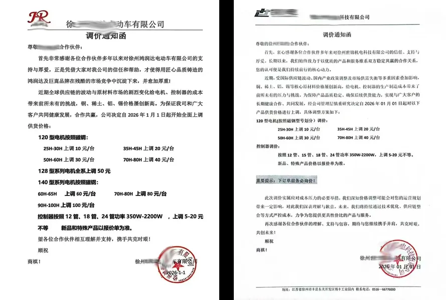 电机成本上涨更为明显。电机中使用的钕铁硼永磁材料(直接影响电机效率和性能)受稀土供应链波动影响,价格持续走强。与此同时,车架所需的钢材、轮毂涉及的铝合金、轮胎的橡胶乃至线束内部的铜材,价格均有不同程度上扬。