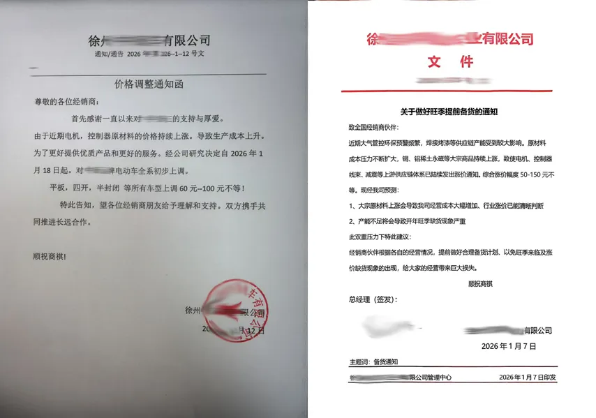 1月下旬,电动车行业迎来密集调价期。超过二十家企业陆续更新价格政策,主流车型出厂价上调100至300元已成普遍现象。这轮涨价与以往不同:范围更广、节奏更快、执行更果断,多数企业将1月底设为原价订单的最后期限。