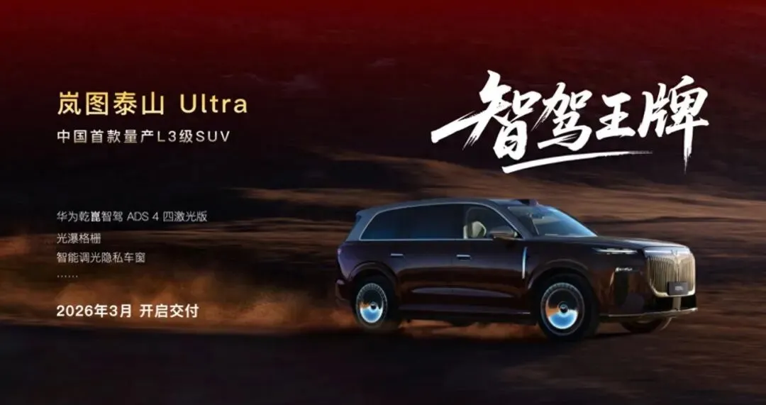 2026年1月28日,岚图汽车在年终媒体答谢会上正式官宣:旗下冲击L3级自动驾驶赛道的重磅车型——岚图泰山Ultra,将于今年3月开启交付。作为华为首款量产L3级SUV,这款车不仅完全按照L3级自动驾驶架构设计,还搭载了最新的华为乾崑智驾四激光方案,智驾硬件和软件实力双双拉满。