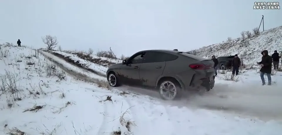灰色宝马X6在雪地爬坡,