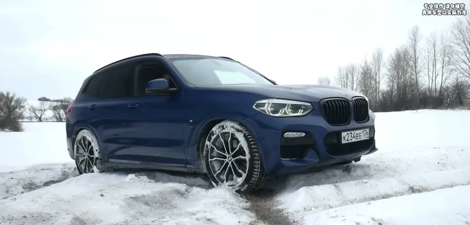 蓝色宝马X3在雪地爬坡,