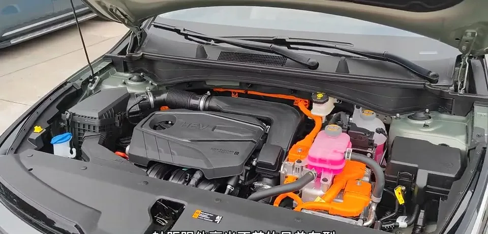 打开引擎盖给大家看一下,这是2.0L的混动系统。说实话我对这套动力总成还是挺期待的,毕竟韩系车的混动技术这几年确实在进步,不像以前那种”干吼不走”的感觉。