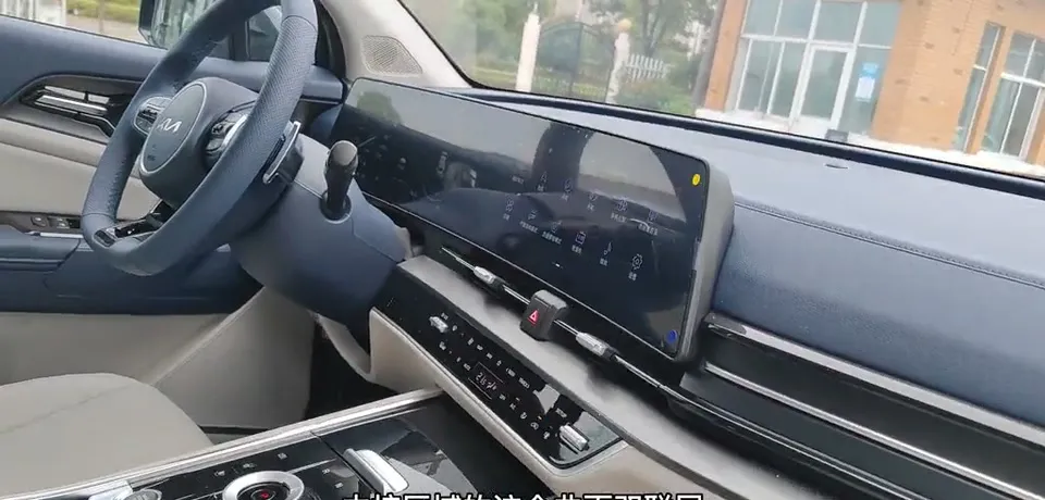 ,科技感直接就拉满了。现在不是都流行这种设计嘛,起亚也跟上了。然后这个驾驶控制面板设计得挺简洁的,不会让你觉得很乱。