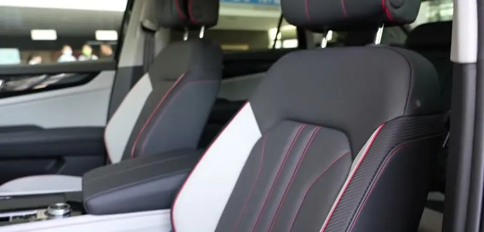 中控这边是亮黑饰板加条纹装饰,我用指甲敲一下,还行,不是那种特别廉价的塑料感。座椅是双拼色的设计,带红色缝线,这个配色我觉得跟外面的红色卡钳是呼应的,设计师还是有点想法的。