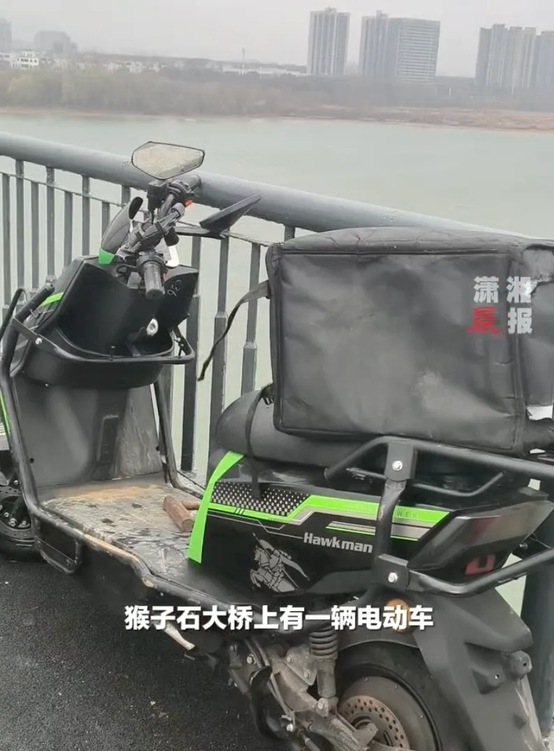 1月30日,长沙市民称有一辆电动车停靠在猴子石大桥上,路过市民关心车主去向。潇湘晨报•晨视频记者实地探访发现,车辆没有牌照和钥匙,车箱内有一件“淘宝闪购”字样的骑手制服。