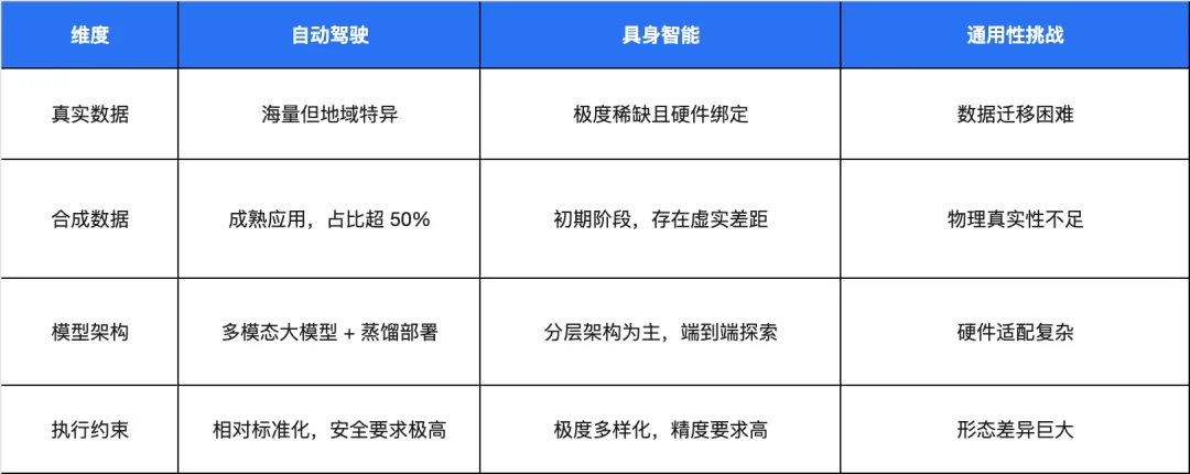 数据层面的通用性制约核心在于:自动驾驶数据虽规模庞大但地域特异性强,不同国家和地区的道路规则、交通环境差异显著;具身智能数据极度稀缺且硬件绑定紧密,跨平台迁移难度极大;而合成数据的通用性则受限于世界模型的质量和物理规律的模拟精度。