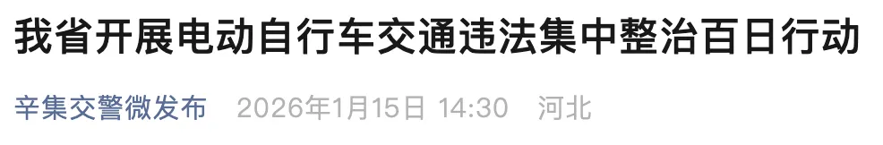 河北省公安厅交通管理局决定自即日起至2026年3月底,在全省开展电动自行车交通安全集中整治行动。通过集中整治,严格规范电动自行车登记上牌、事故溯源、宣传教育、通行治理、停放管理等关键环节。