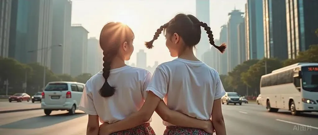 两个女中学生,穿着布衬衫和花布小裙子,头上梳着两条麻花辫,挽手漫步在上海的淮海路上。
