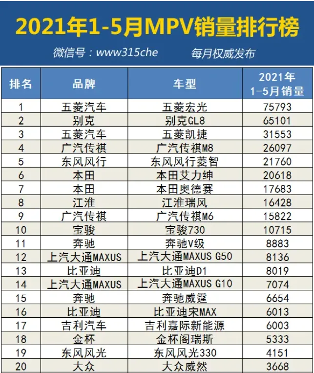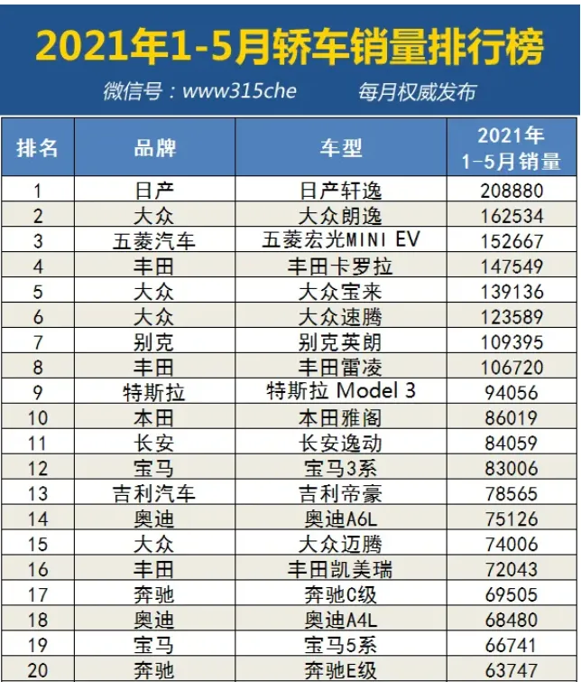 >2021年1-5月TOP 20的轿车,SUV及MPV销量