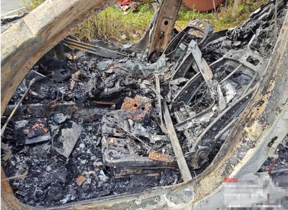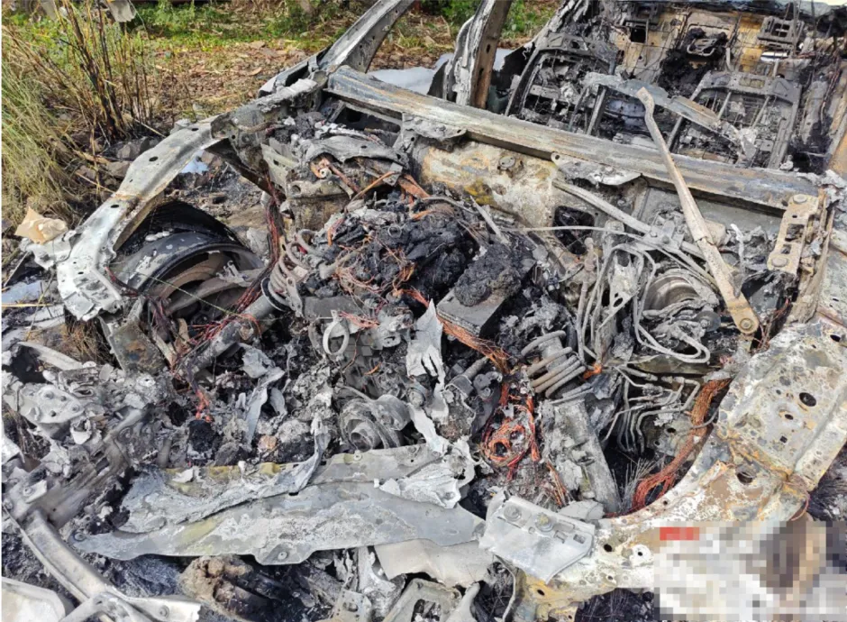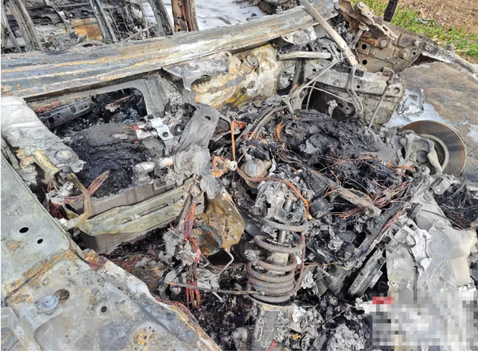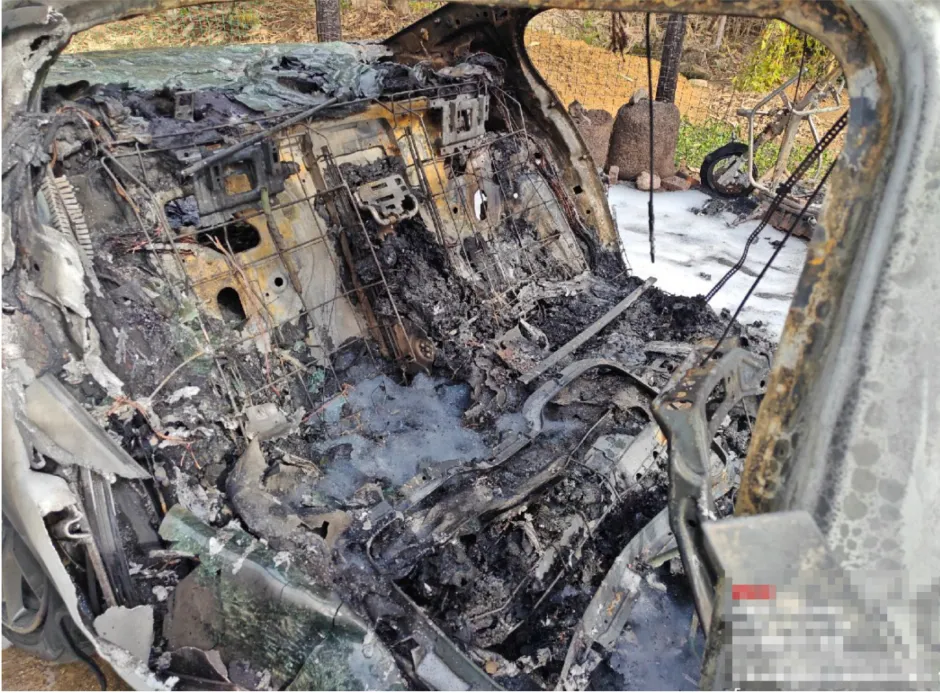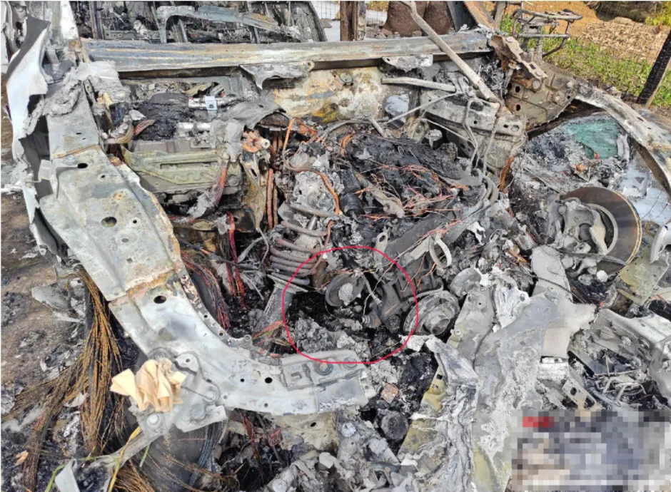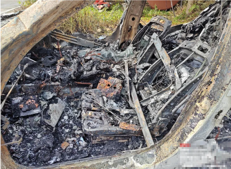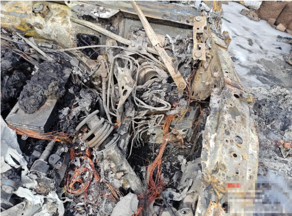 要点2:对比左右两侧的车门,其烧损程度呈现左重右轻。右前门整体剩余残骸少于右后门遗留的残骸,因此判断起火点可能是在驾驶舱的左前区域。