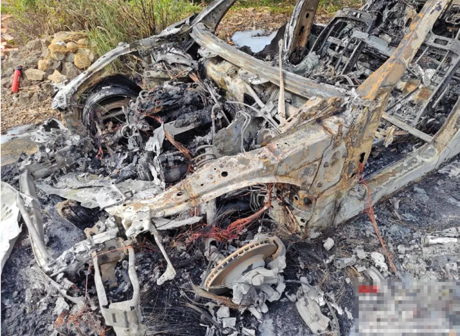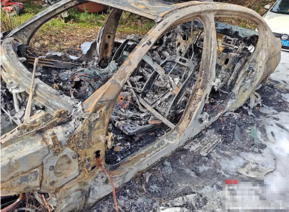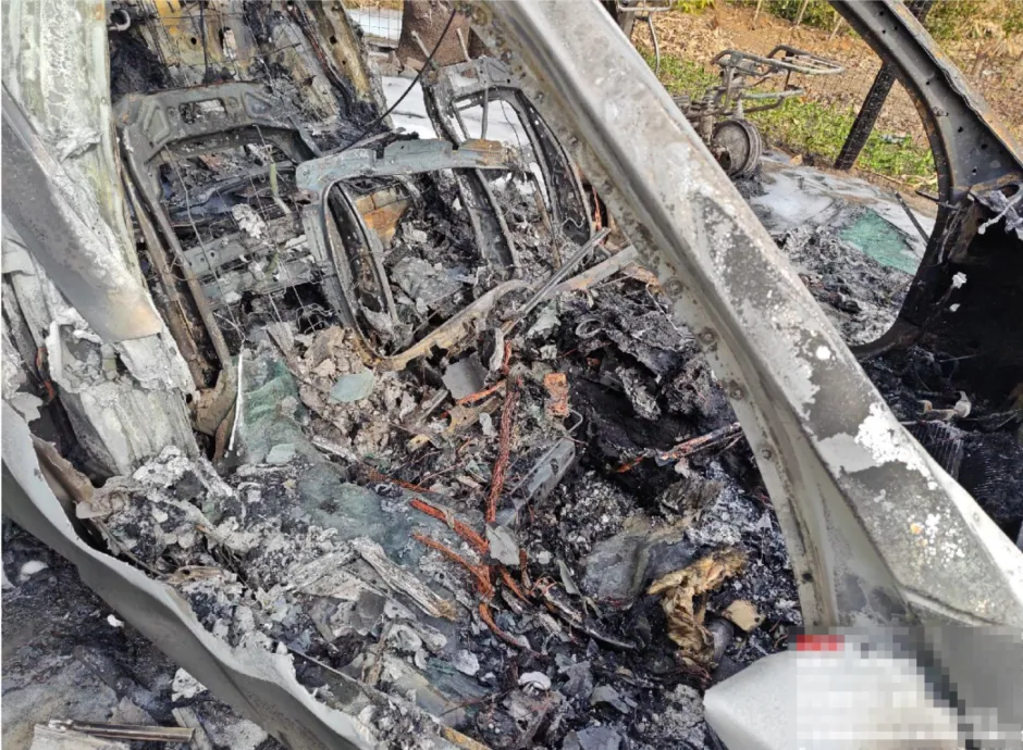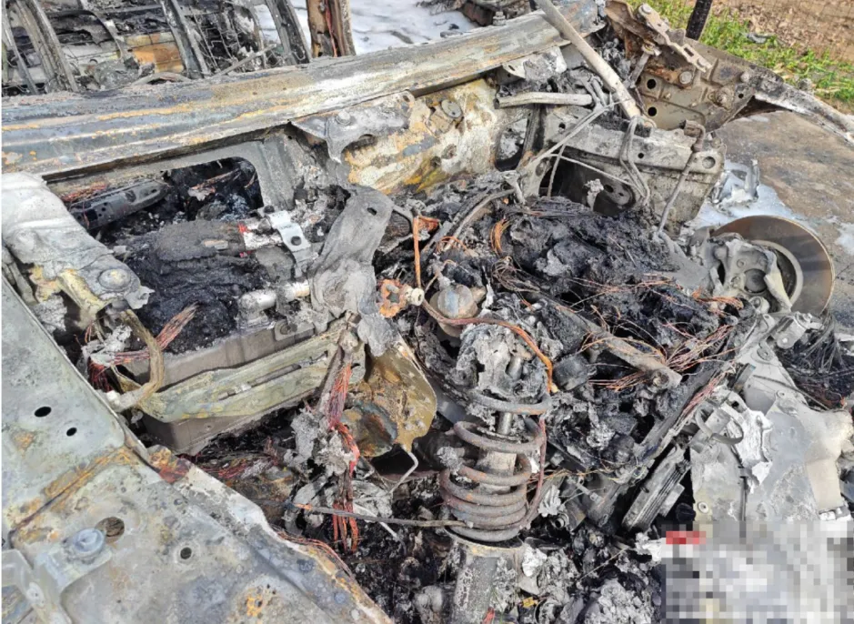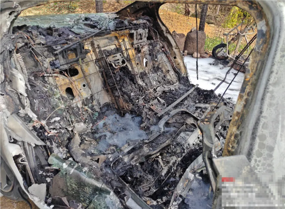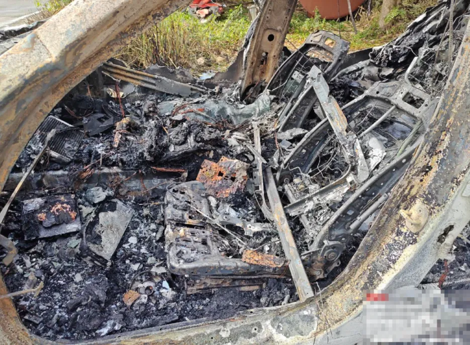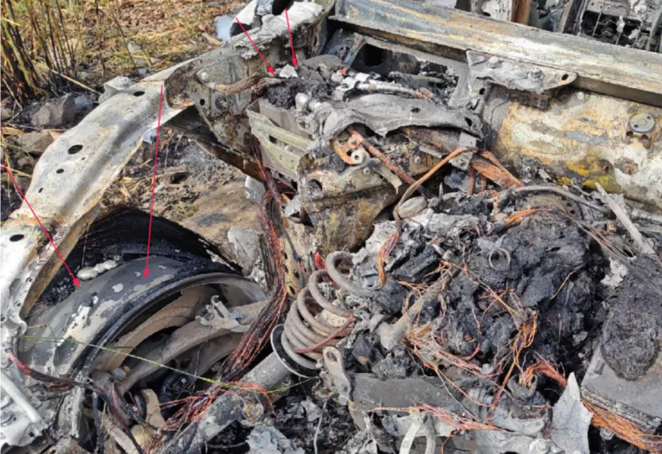 要点2:对比左右两侧的车门,其烧损程度呈现左重右轻。右前门整体剩余残骸少于右后门遗留的残骸,因此判断起火点可能是在驾驶舱的左前区域。
