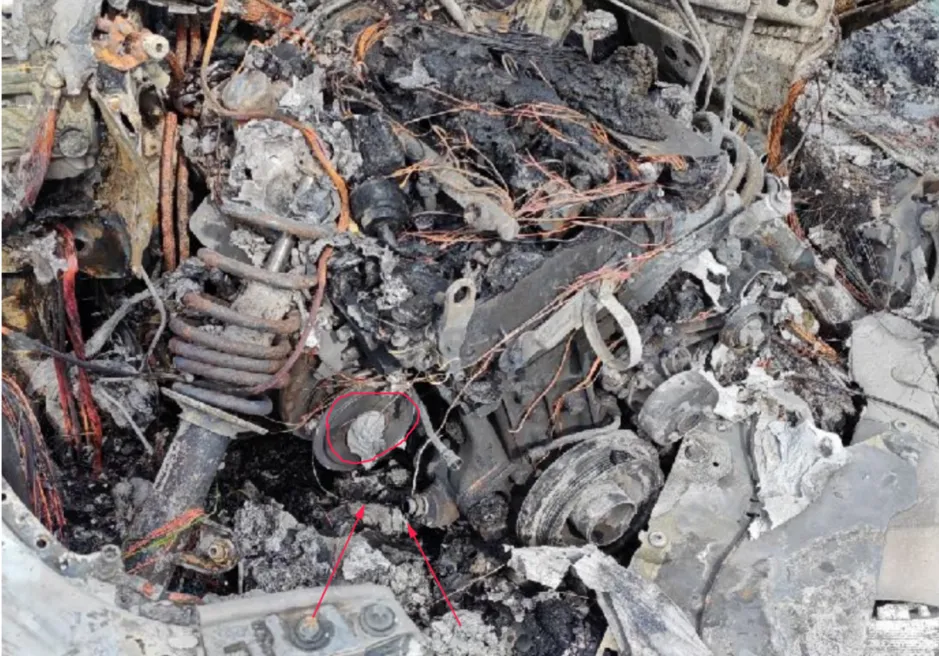 要点1:发动机顶部和发动机舱右后部的区域尚有易燃性较好的塑料件残骸,而驾驶舱内的主驾驶座椅烧的只剩下骨架,因此判断驾驶舱烧损比发动机舱严重,火焰从驾驶舱向发动机舱扩散。