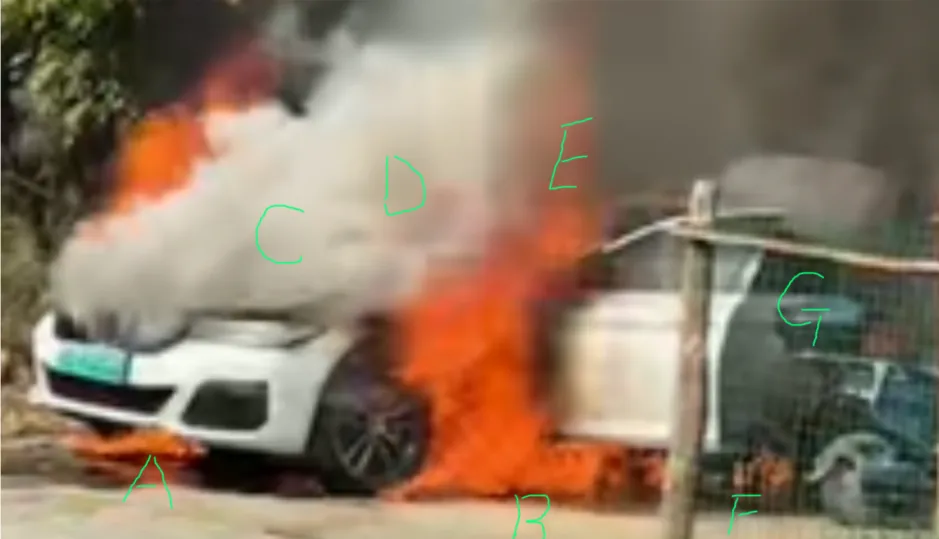 要点9:观察C.D.E,此时的火焰是车身左侧和右侧冒出向上,而C区的发动机舱盖和D区的前挡风玻璃区域没有火焰冒出。说明此时火焰并未烧穿前挡风玻璃和发动机舱盖。