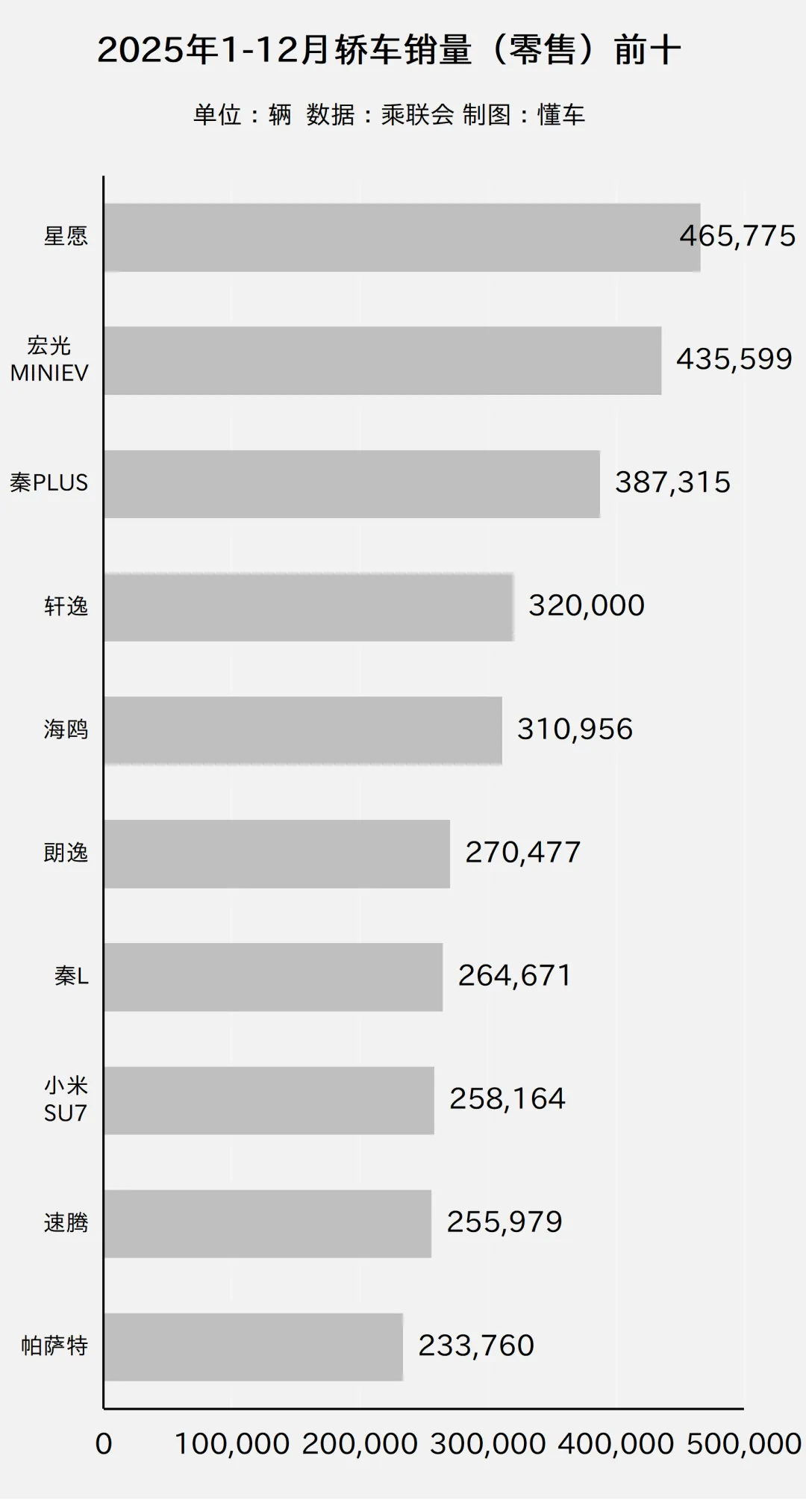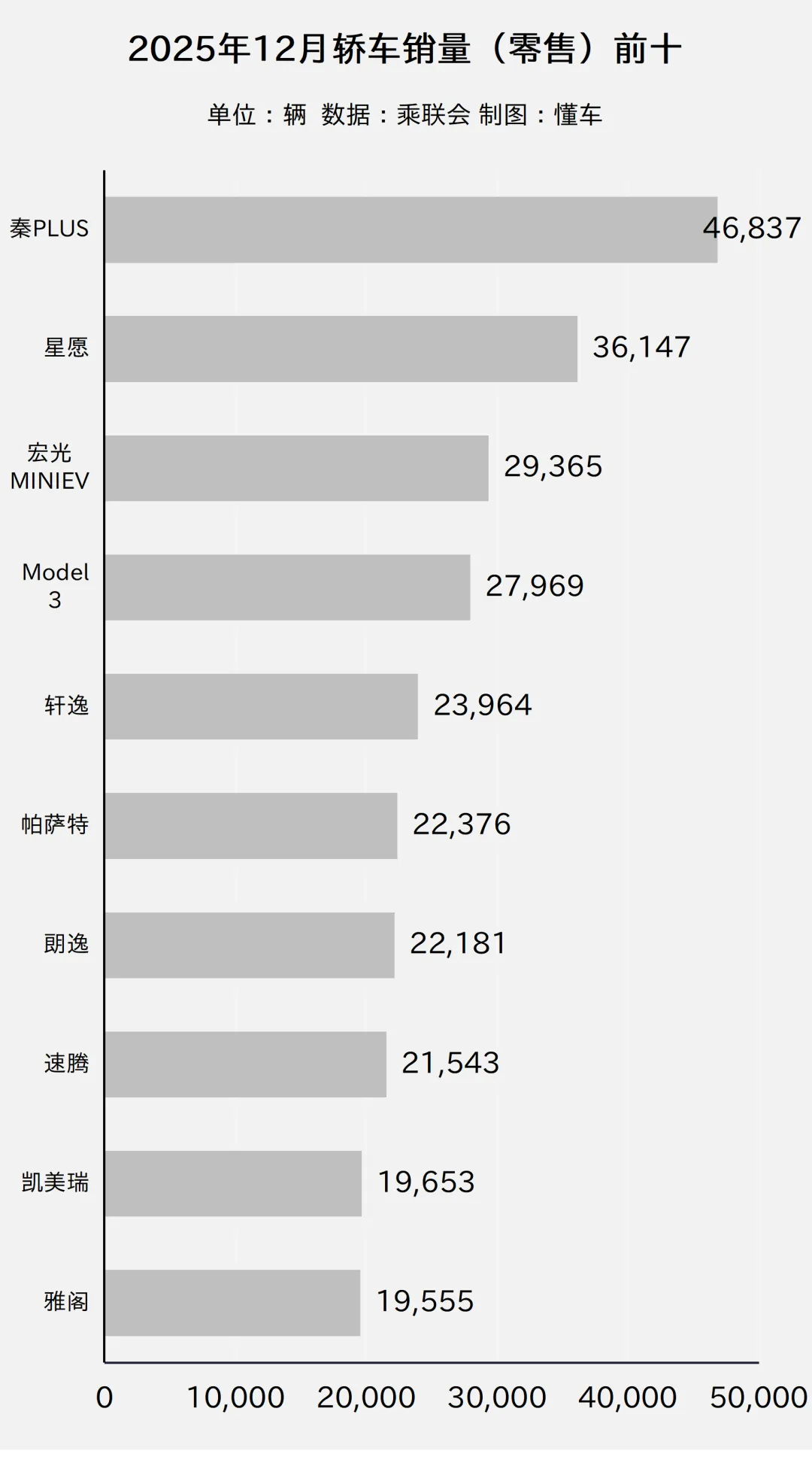 12月的销量数据藏着更有意思的信号。当月轿车总销量97.8万辆,同比下降15.1%,环比跌2.9%。但燃油车在这个月发起了反攻,帕萨特、凯美瑞、雅阁纷纷重回前十,前四之外的第六到第十全是燃油车。