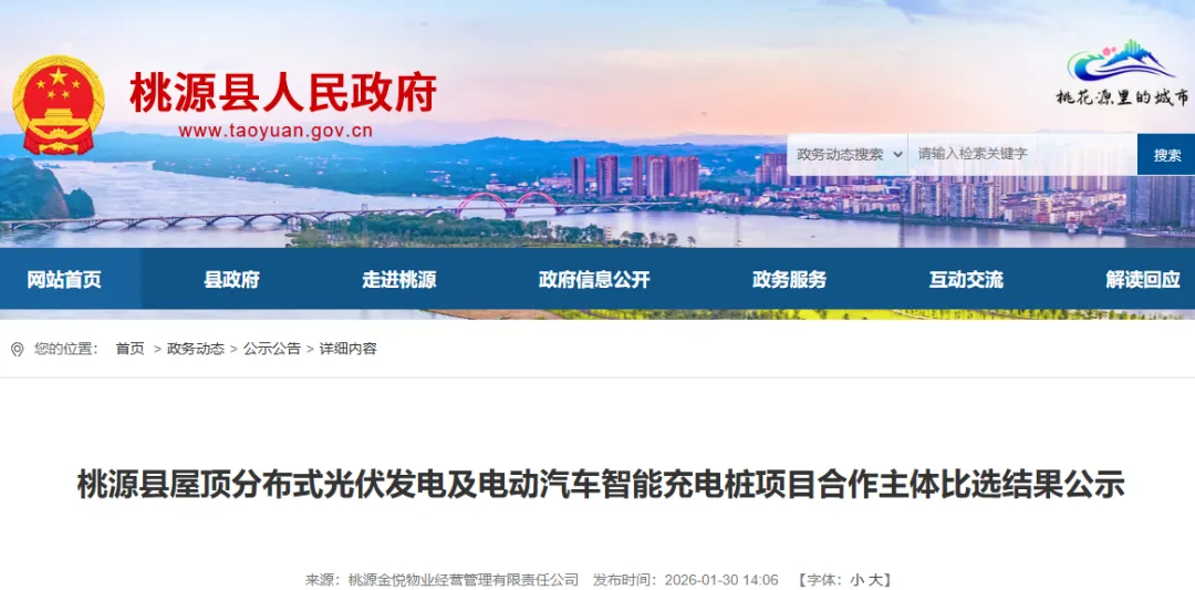 桃源县屋顶分布式光伏发电及电动汽车智能充电桩项目合作主体于2026年1月30日09时30分(北京时间)在桃源金悦物业经营管理有限责任公司(桃源县七里桥办公区3楼)会议室举行开标、评标会。评标委员会按照比选文件确定的评标办法,对所有有效标书进行了详细的评阅,评委们经过集体充分评议,推荐的成交候选人为: