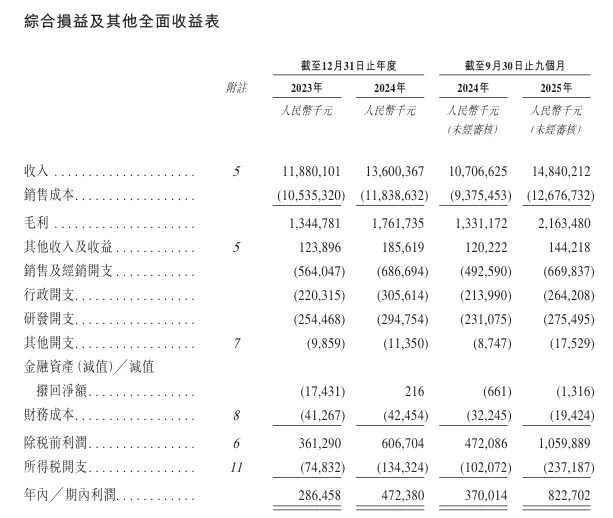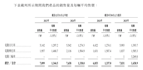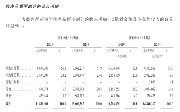 招股书显示,在过去的2023年、2024年和2025年前九个月,台铃电动车的营业收入分别为人民币118.80亿、136.00亿和148.40亿元,相应的净利润分别为人民币2.86亿、4.72亿和8.23亿元。