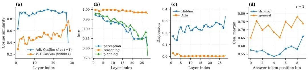 要传功,先得知道“内力”藏在模型的哪个“穴位”(网络层)里。总不能让学生把老师每一层的状态都模仿一遍,那样负担太重,还可能学杂了。Drive-KD的作者们做了一件非常扎实的工作:系统性预研究。他们像做CT扫描一样,深入剖析了大模型在处理驾驶问题时,内部发生了什么。图2:InternVL3-8B模型的预研究总结:(a) 用余弦相似度衡量的层间蒸馏对齐度(相邻层和层内视觉-文本),(b) 跨层的、按能力划分的组内相似度,(c) 隐藏状态和注意力图的层间离散度(1-余弦相似度),(d) 在τ≈1.0时,比较驾驶数据和通用数据在答案段上的位置归一化广义间隔。他们主要研究了两个核心问题:1. 在哪儿蒸馏?(选哪一层?) 2. 蒸馏什么?(模仿老师的什么内部信号?)注意力信号是关键:早期层管感知,中间层管推理,末期层管规划