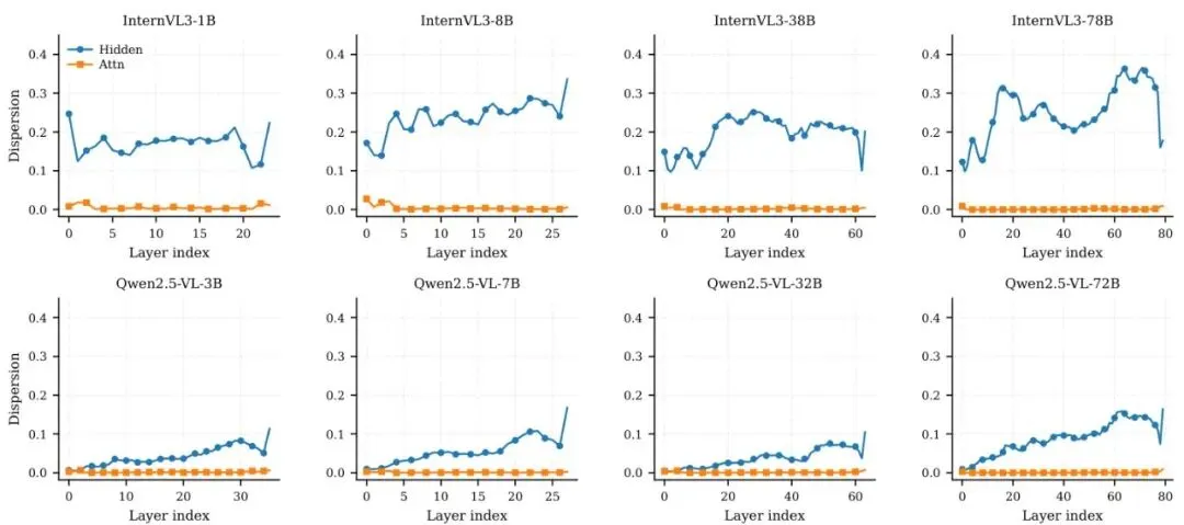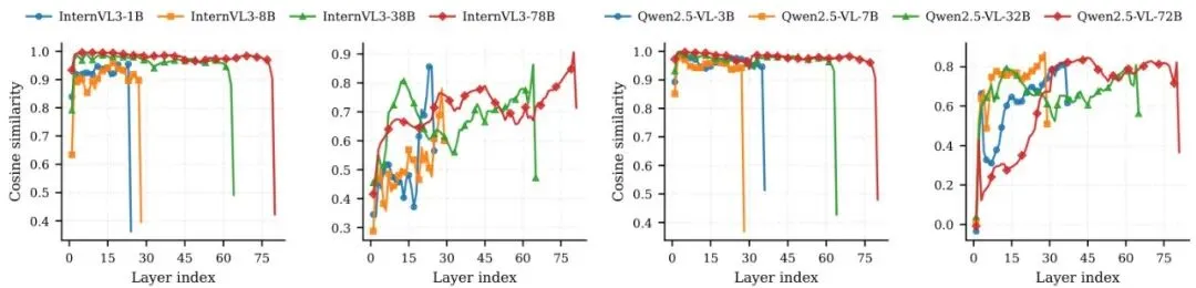 观察模型各层表示变化和视觉-文本融合的程度。他们发现,第一层(Layer 1)和倒数第二层(Penultimate Layer)是信息发生剧烈变化和深度融合的关键位置。图4:跨模型家族和规模的层间相似度曲线。展示了InternVL3 (1B/8B/38B/78B) 和 Qwen2.5-VL (3B/7B/32B/72B) 的相邻层余弦相似度(Adj. CosSim)和层内视觉-文本余弦相似度(V–T CosSim)。