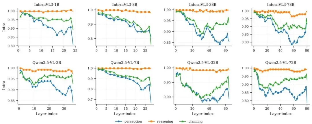 他们计算了能力组内相似度,看看处理同一类能力(如所有感知问题)时,不同图片在哪个层的特征最稳定、最一致。结果非常有趣(见图2b和下图):图5:跨Transformer层的、按能力划分的组内一致性(平均成对余弦相似度)。展示了InternVL3(上行)和Qwen2.5-VL(下行)在感知、推理、规划三种任务类型下的表现。