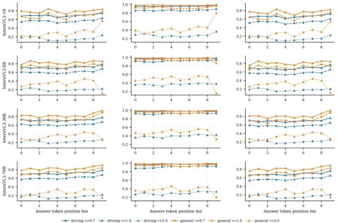 用第一层来蒸馏“感知”能力,用一系列中间层来蒸馏“推理”能力,用倒数第二层来蒸馏“规划”能力。 这和我们的直觉完美契合!👍确定了穴位,下一步是确定传递什么“内力”。常见的候选有:隐藏状态(神经元激活值)和注意力图(Attention Map)。注意力图可以理解为模型在处理信息时,对输入不同部分的“关注程度”。图6:InternVL3和Qwen2.5-VL模型家族在问题重述下的隐藏状态 vs 注意力离散度对比。每个子图对应一个模型;X轴是Transformer层索引,y轴是离散度,以1-余弦相似度衡量。报告了最后词元隐藏表示(Hidden)和平均头注意力图(Attn)的曲线。数值越低表示信号在不同问题表述下越稳定。作者比较了这两种信号在面对同一张图片、不同问法(比如“前面有什么车?”和“前方车辆情况如何?”)时的稳定性。他们发现,注意力图比隐藏状态稳定得多!这意味着,无论问题怎么问,模型“看”图的方式(注意力)是更本质、更能力相关的。因此,Drive-KD选择蒸馏注意力图作为核心信号。他们还重新审视了传统的输出分布对齐(即KL散度蒸馏),发现对于自动驾驶任务,老师的输出分布往往不够自信、比较分散(见图7,8),直接模仿这个“模糊”的答案反而会引入噪声,因此Drive-KD没有使用这种蒸馏方式。图7:InternVL3家族在答案词元位置分箱上的输出分布对齐(KL)分析。行对应模型(1B/8B/38B/78B),列报告三个置信度指标:top-1概率 m,top-10概率和 S,以及广义间隔。每个子图在三个温度(τ∈{0.7, 1.0, 2.0})下比较驾驶答案与通用答案。多教师协作遇冲突?非对称梯度投影巧化解