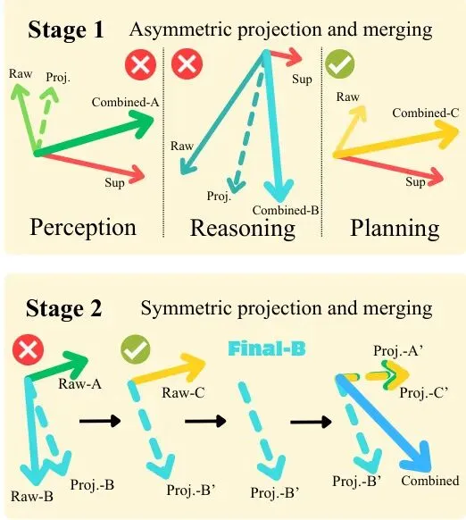 有了单能力蒸馏的“配方”,最理想的情况是训练一个“全能小学霸”,同时掌握三种能力。这就需要多教师蒸馏:感知老师、推理老师、规划老师一起上阵,在每个训练批次中都指导学生。但问题来了:三个老师教的“内功”万一互相冲突怎么办?比如,规划老师说“注意前方”,感知老师说“注意左侧”,模型参数更新时该听谁的?这种梯度冲突会导致训练不稳定,可能提升一个能力而损害另一个。图3:非对称梯度投影(AGP)示意图。阶段1在每个能力内部使用非对称的锚点-跟随者投影并合并结果更新。阶段2跨能力应用洗牌对称成对投影以获得最终梯度方向(以梯度B为例展示)。Drive-KD提出了一个巧妙的解决方案:非对称梯度投影(Asymmetric Gradient Projection, AGP)。这个方法的精髓在于分清主次、化解矛盾:
