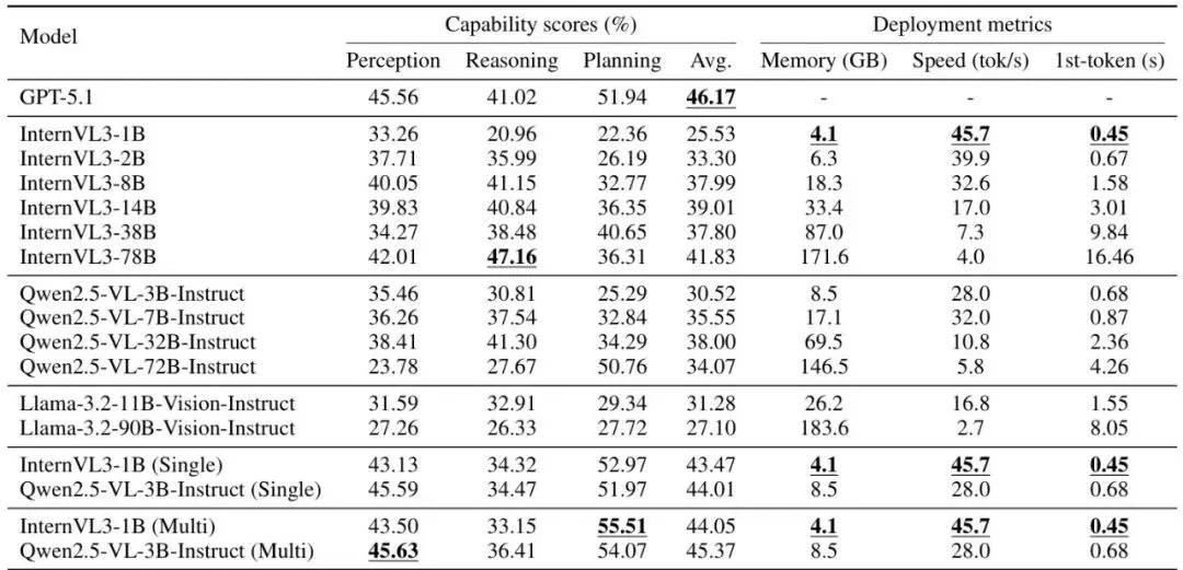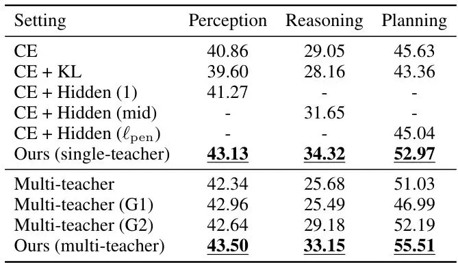 1. 单教师蒸馏已显神威:经过单能力蒸馏后的InternVL3-1B(Single),平均得分从25.53飙升至43.47!规划得分达到52.97,已经超过了GPT-5.1的51.94!这说明他们找到的“穴位”和“内力”(注意力)确实有效。