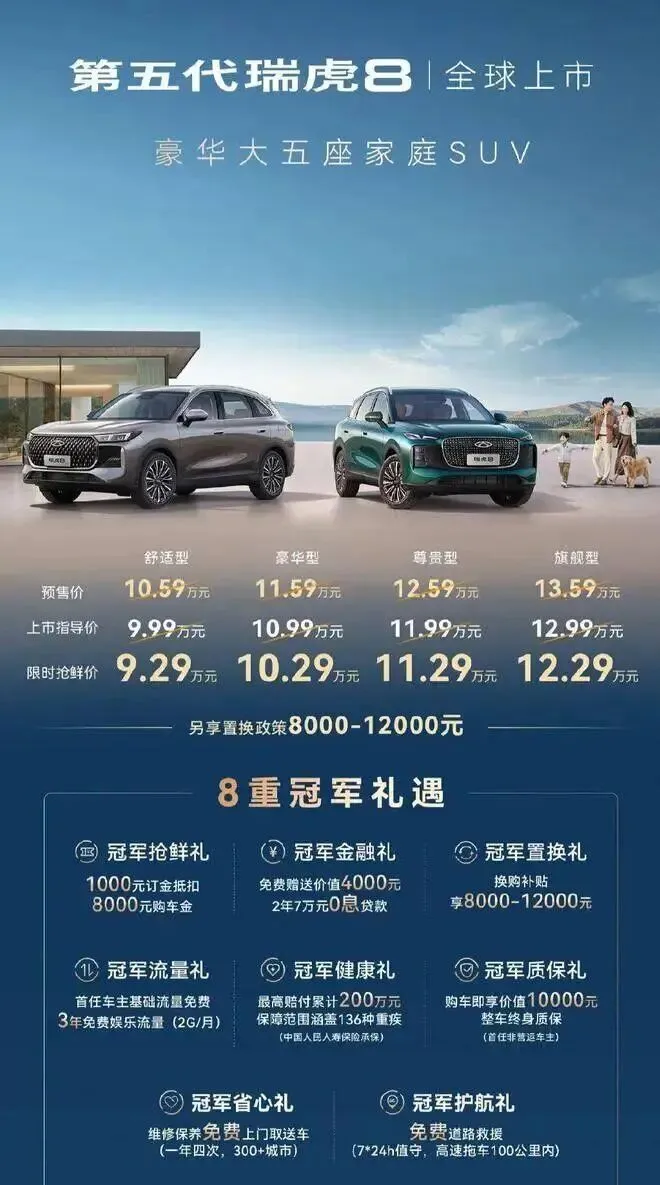 关于第五代瑞虎8,我就一句话开场——这车一出,长城和长安的心估计都要抖一下。官方价9.99-12.99万还不够狠?限时再减7000,置换补贴顶到1.2万,2年7万0息。算下来,入门价压到9.29万。这价格直接朝“紧凑级买菜车”开炮。