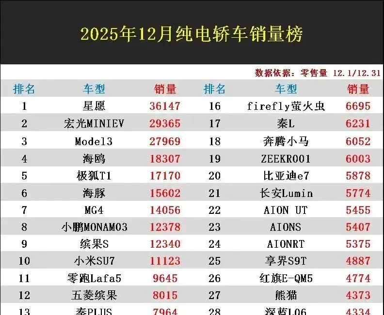 兄弟们,刚扒完2025年12月纯电轿车销量榜,我手一抖差点把手机摔了——上个月还霸榜的宏光MINIEV,这个月直接断崖式下跌,比上个月少了2.5万辆!简直比双十一退货还狠。而吉利星愿一骑绝尘,狂卖3.6万辆,登顶榜首。特斯拉Model3稳坐第三,海鸥、极狐T1也杀进前五。可比亚迪那些老将,秦PLUS、海豹06这些,销量才6千出头,直接跌出前十。AIONS倒是小爆发,卖了5407辆,但日产N7跌到47名,昊铂GT、蔚来ET7这些,销量才几十辆,惨得像被车圈遗忘的孤儿。