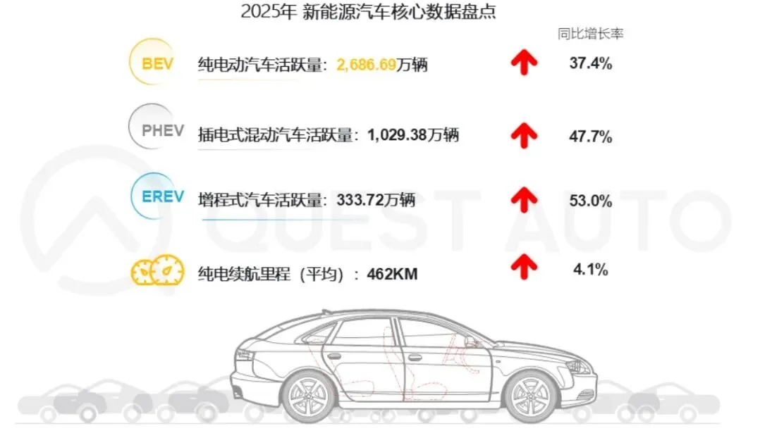 但从产业数据来看,这一定位已经明显滞后。公开数据显示,2025年,新能源汽车整体活跃量超4000万辆,其中,纯电动活跃量近2700万辆,同比增长37.4%。