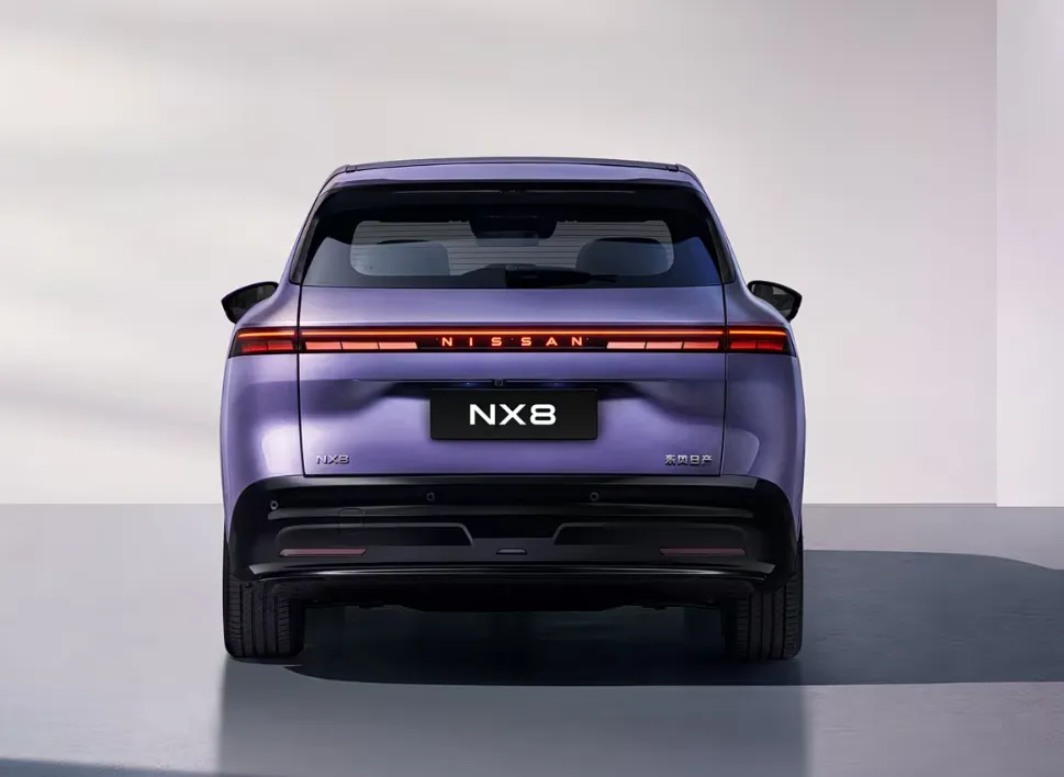 外观方面,日产NX8外观采用家族最新的V-motion设计语言,星环式贯穿灯组与可发光LOGO彰显科技感,车身侧面拥有流畅简洁的线条,搭配隐藏式门把手,双色低风阻轮圈时尚感更强。新车的量子光幕尾灯由2064颗OLED光源组成,可自定义灯语,车身的长宽高分别为4870/1920/1680mm,轴距2917mm。