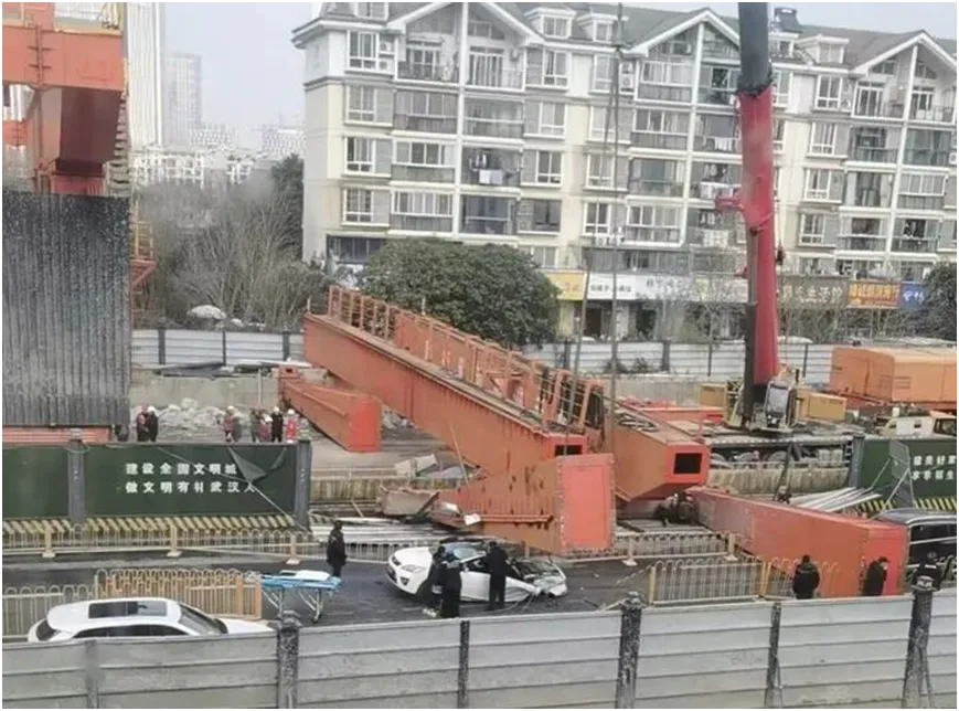 2月1日11时16分许,湖北武汉后湖大道一处地铁施工收尾阶段的工地旁,一台大型橙色龙门吊突然发生坍塌。根据网友发布的行车记录仪视频显示,龙门吊主梁先出现倾斜,随后整体倒向外侧路面,正好砸中下方行驶中的白色轿车,车身严重变形压缩至原长1/3;紧随其后的一辆黑色SUV紧急避让,仅车头轻微擦碰护栏。事故发生后,现场迅速被围挡隔离,救援人员已第一时间到场处置。