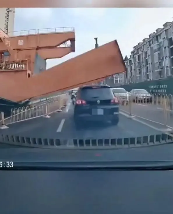 2月1日上午11点许,武汉后湖大道上,一辆白色轿车奔跑着,旁边地铁施工的大型橙色龙门吊突然倾斜,就把穿行的这辆轿车给砸了。