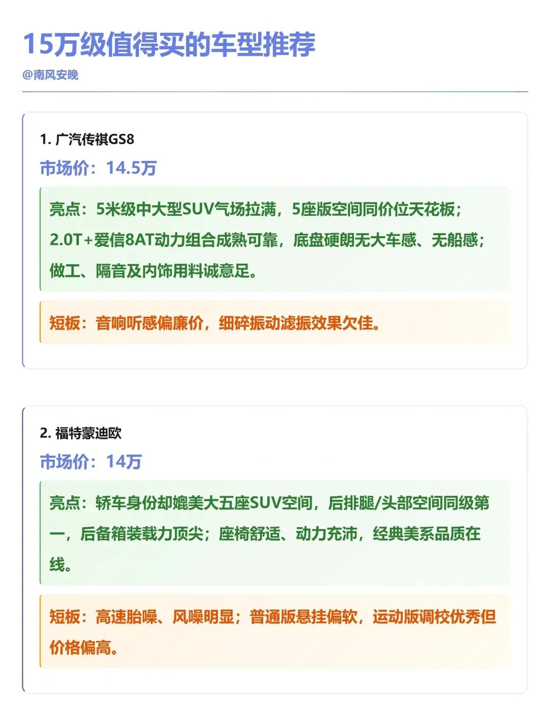 15万想买一台空间像样、动力够用、家里人坐着还得有点体面儿的SUV——说实话,选错一步,后面几年都在心里骂自己。 我盯着这份「15万级值得买车型推荐」名单,看完配置和价格,再结合我这几年接触到的车主反馈,干脆给你来一篇「掏心掏肺版复盘」。