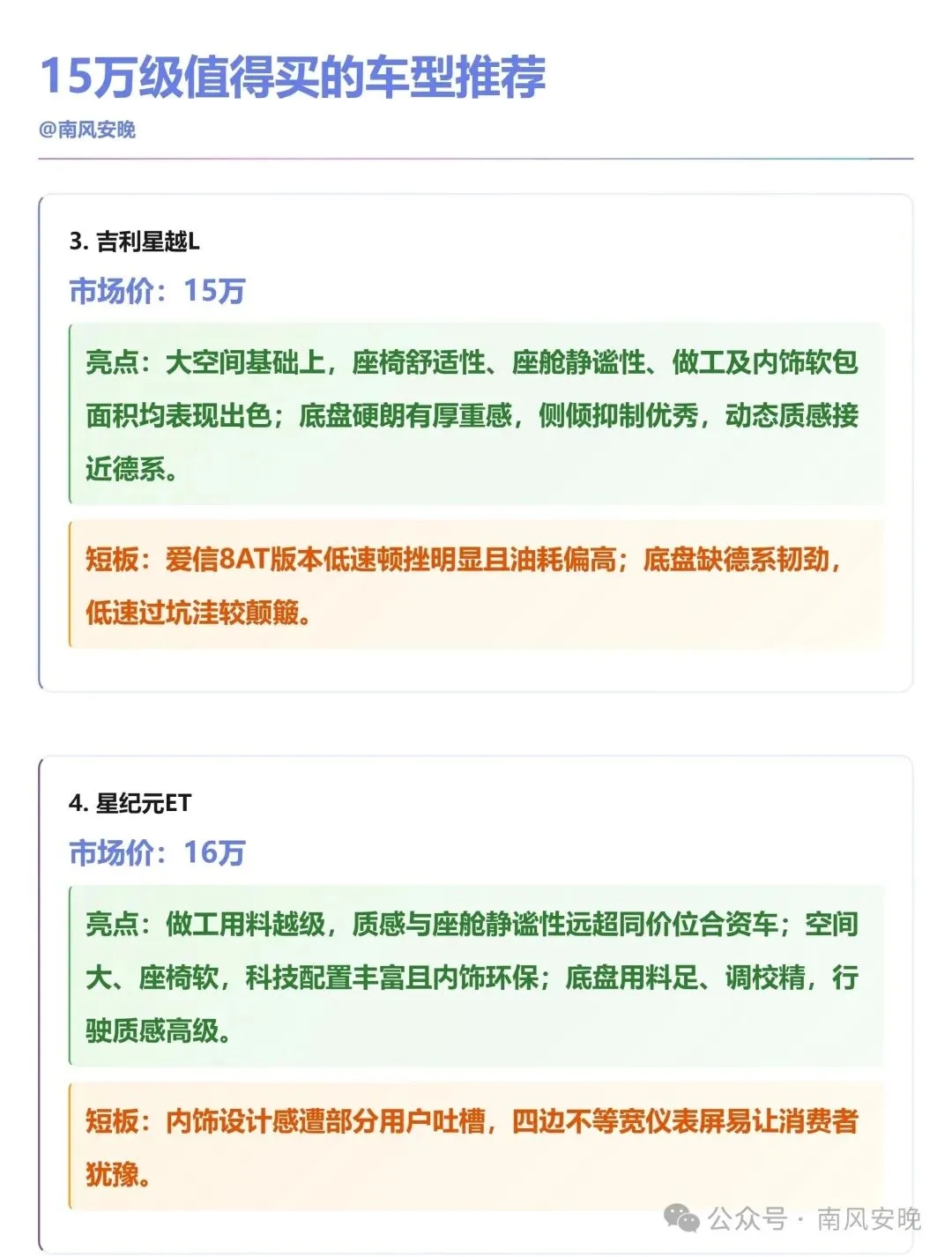 来看吉利星越L,市场价写的是15万。 推荐理由:大空间、座椅舒服、车内静谧性不错,用料和软包也下本,底盘有厚重感,侧倾抑制好,动态质感更接近德系。 短板集中在两点:爱信8AT低速顿挫、油耗偏高;底盘还没完全到德系那种细腻程度,高速过弯略显紧张。