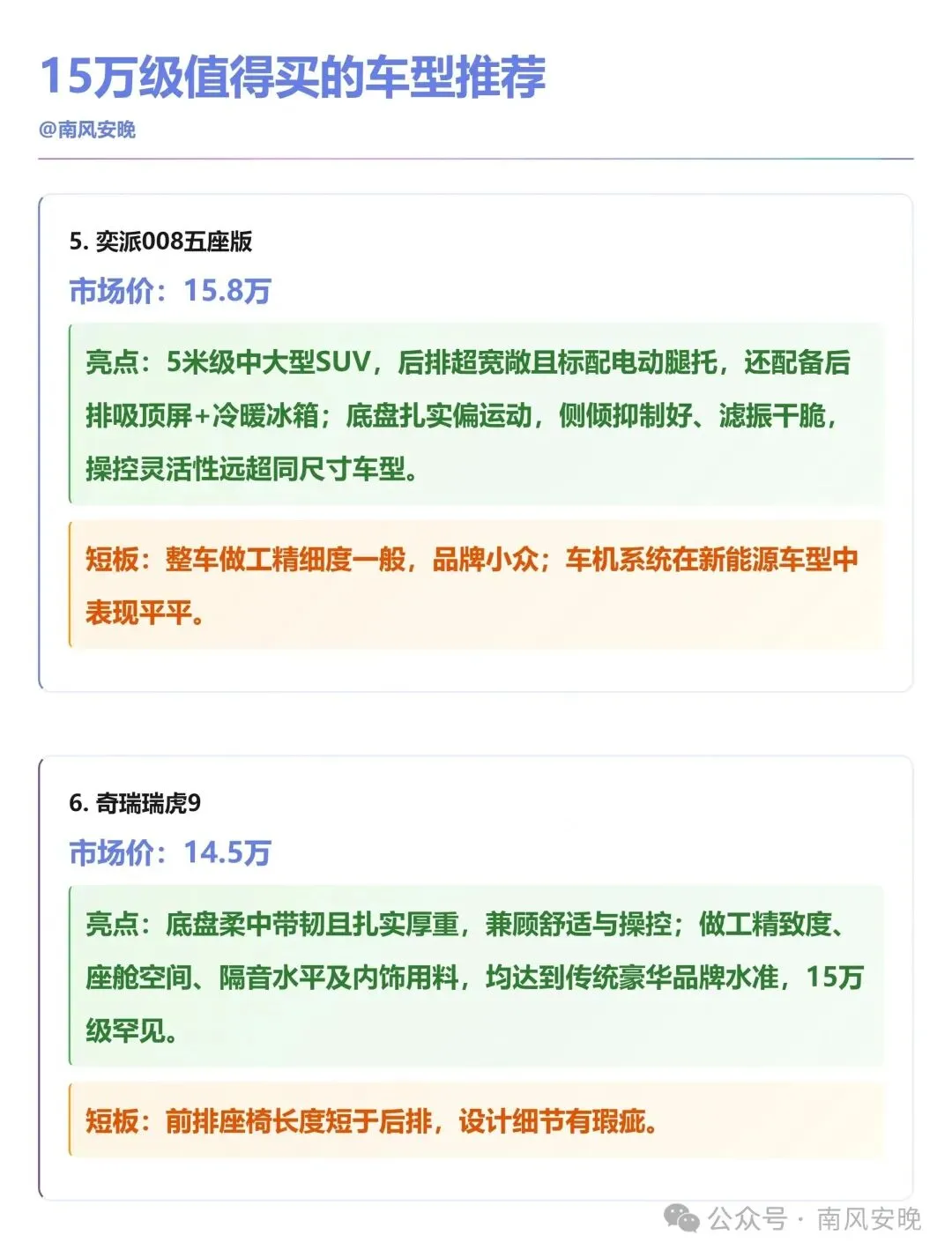 清单里瑞虎9的市场价写的是14.5万,看得出是想当「平价豪华感担当」。 描述挺到位:底盘偏软但带点厚重,兼顾舒适和操控;做工精致、座舱空间够用;隔音水平和内饰用料都能摸到传统豪华品牌的水准,在15万区间算是上路有面儿那一挂。
