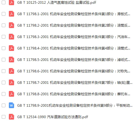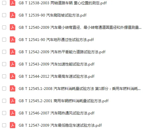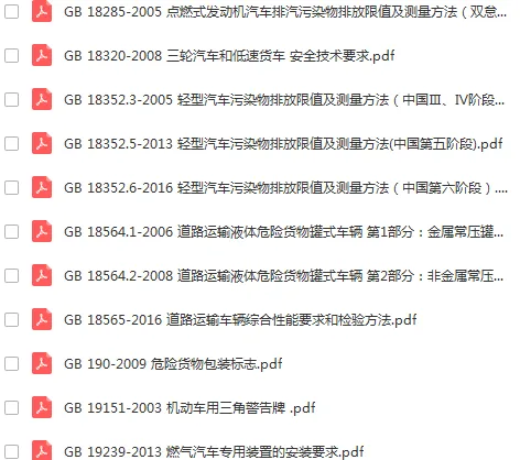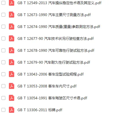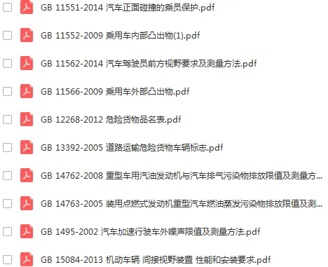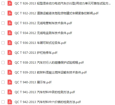 原始部分:413份整车标准。包含混合动力汽车安全及动力评价标准,电动车技术及试验标准,整车排放要求及测量方法,机动车安全检测技术及方法,汽车加速等性能评价方法,汽车耐久可靠性试验方法,无线电监测等内容。