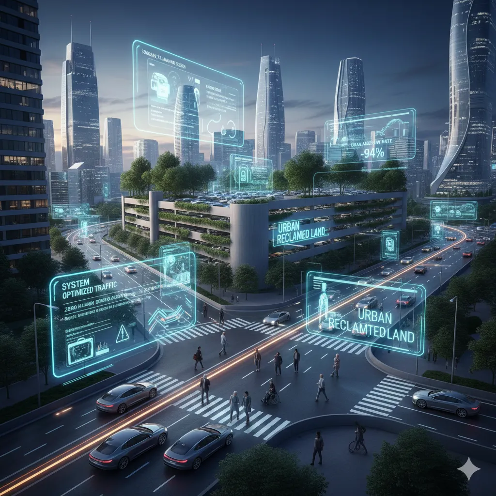 城市空间释放:城市中约15%-30%的土地目前被停车场占据。由于无人车可以“不停转”或精准停靠在偏远车库,城市中心的大量停车场可转化为公园、绿地或住房,极大改善人居环境。