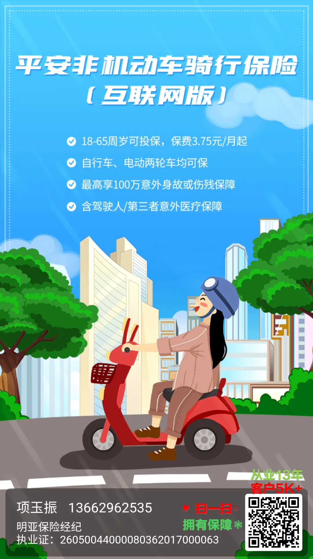 平安·非机动车骑行保险·自行车、电动车均可保·第三者责任·18~65岁保10-50万一年·3档可选