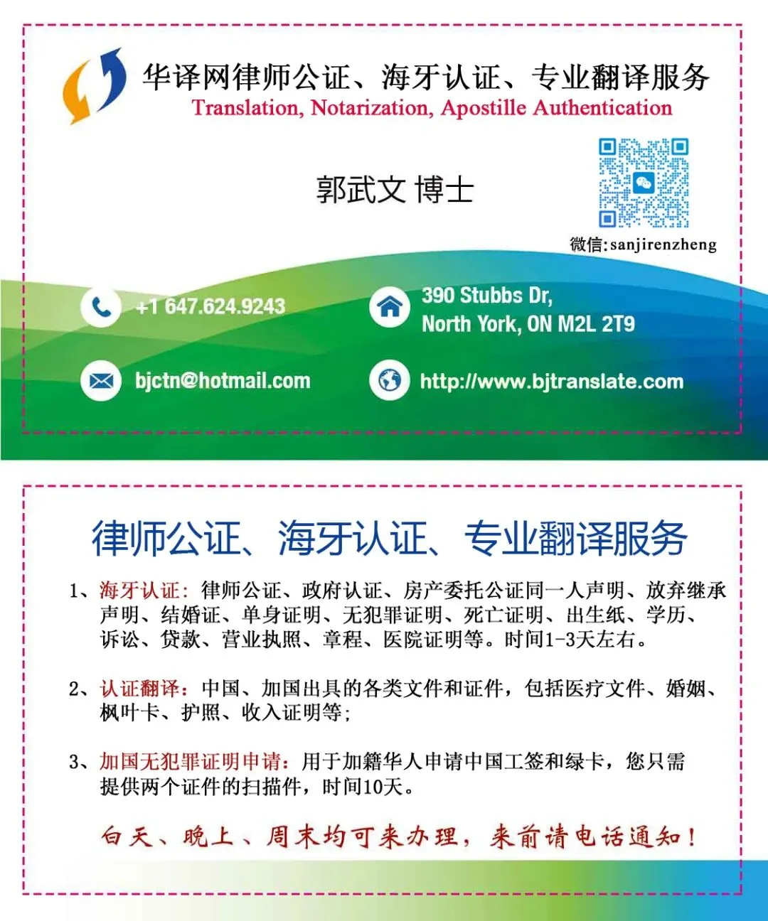 从2024年1月11日开始我们代办海牙认证(国内也称为附加证明书认证)业务,周期1-3天左右,覆盖加拿大和美国全境。在律师公证和海牙认证(相当于以前的领事馆认证的前两级)方面拥有十多年丰富经验,已经为数千名海外华人成功办理海牙认证,包括出生证、结婚证、无犯罪证明和公司注册文件等加拿大政府签发的上百种证件,售房委托书、诉讼委托书、同一人声明书、遗产放弃声明书等上百种个人签署的文件。另外提供各类移民文件的公证/认证翻译服务,签证/续卡/入籍等相关服务。提供中国境内公证处出具的中英文出生公证和无犯罪证明公证书代办服务,用于世界各地。欢迎惠顾!