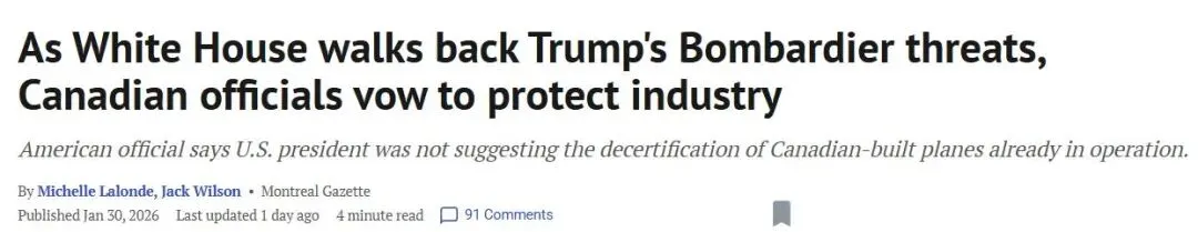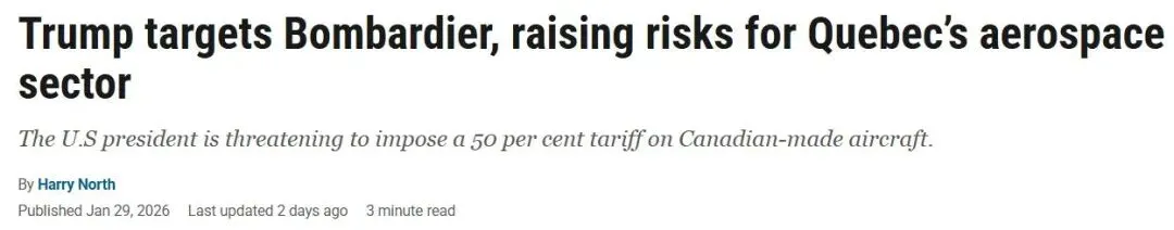 2. 特朗普开炮加拿大王牌产业,50%关税+“禁飞”威胁!加拿大誓言力保庞巴迪!面对白宫方面的最新威胁,加拿大联邦和魁北克省的政界人士周五纷纷向本国的航空航天业传递信心。