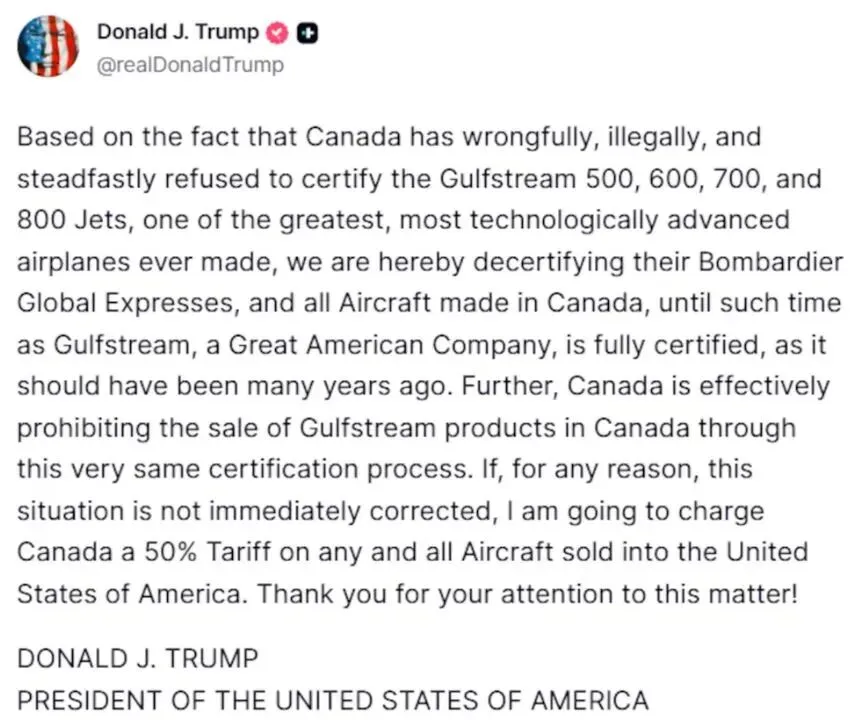 特朗普在其发文中指责加拿大“错误、非法且顽固地”拒绝认证美国飞机。虽然一些湾流飞机已获得加拿大运输部(Transport Canada)批准,但另一些仍在等待审批中。
